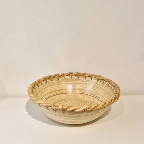 Cuenco de Bambú con el borde trenzado de fibras naturales, ideal para centro de mesa o para poner frutas.