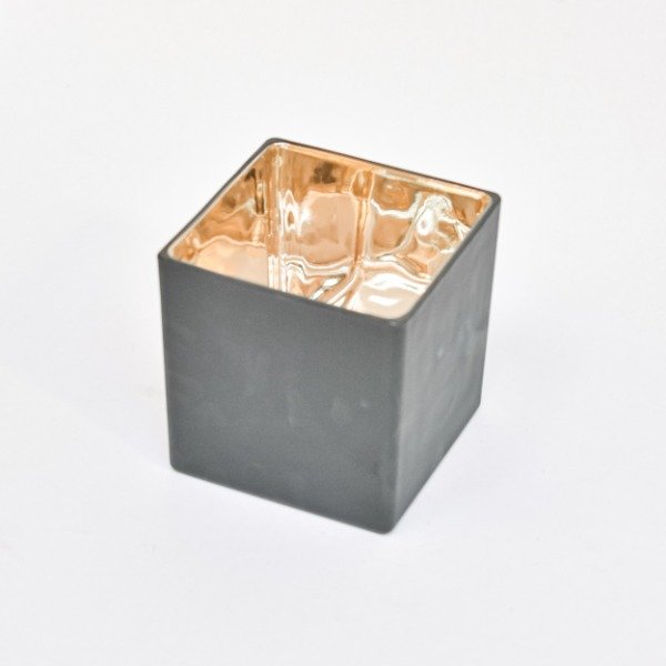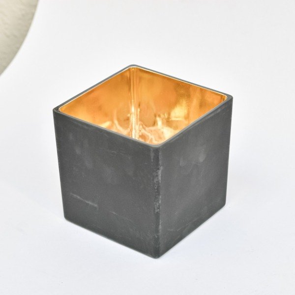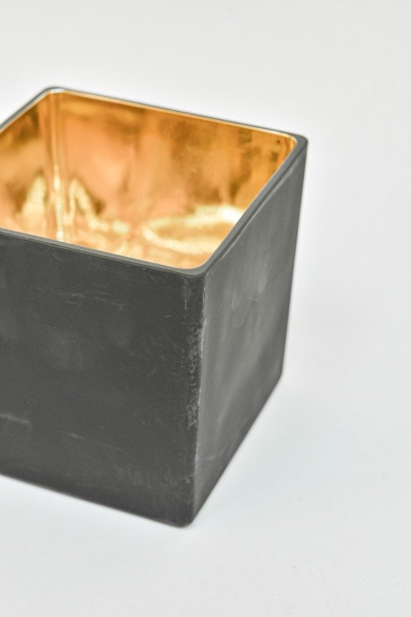 Recipiente de vidrio negro con dorado.